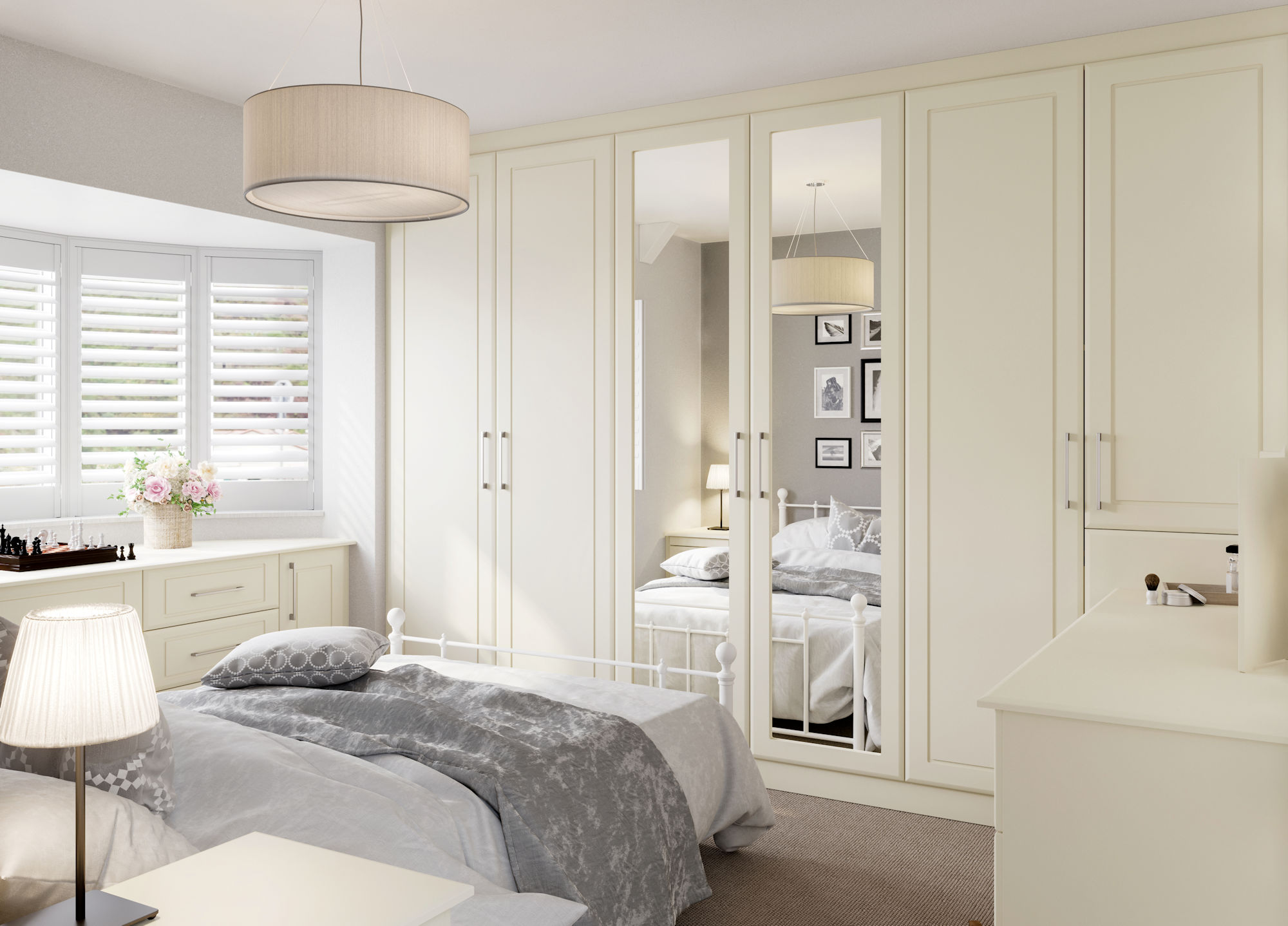 The simple detailing of Bergen creates a calming tranquil space. The mirrored doors give the added benefit of reflecting the light whilst being a practical feature.