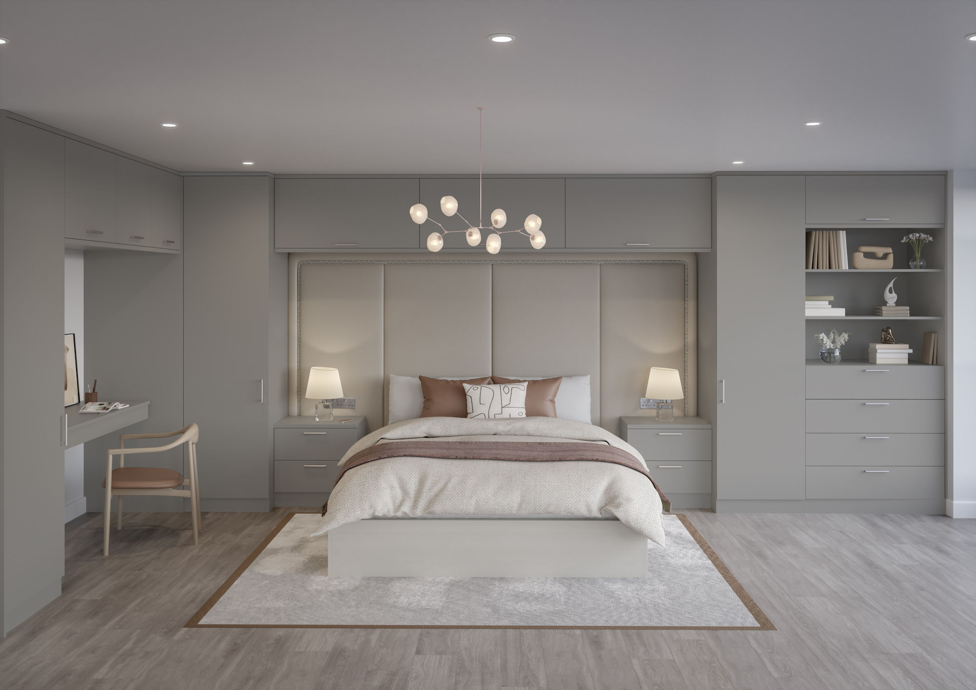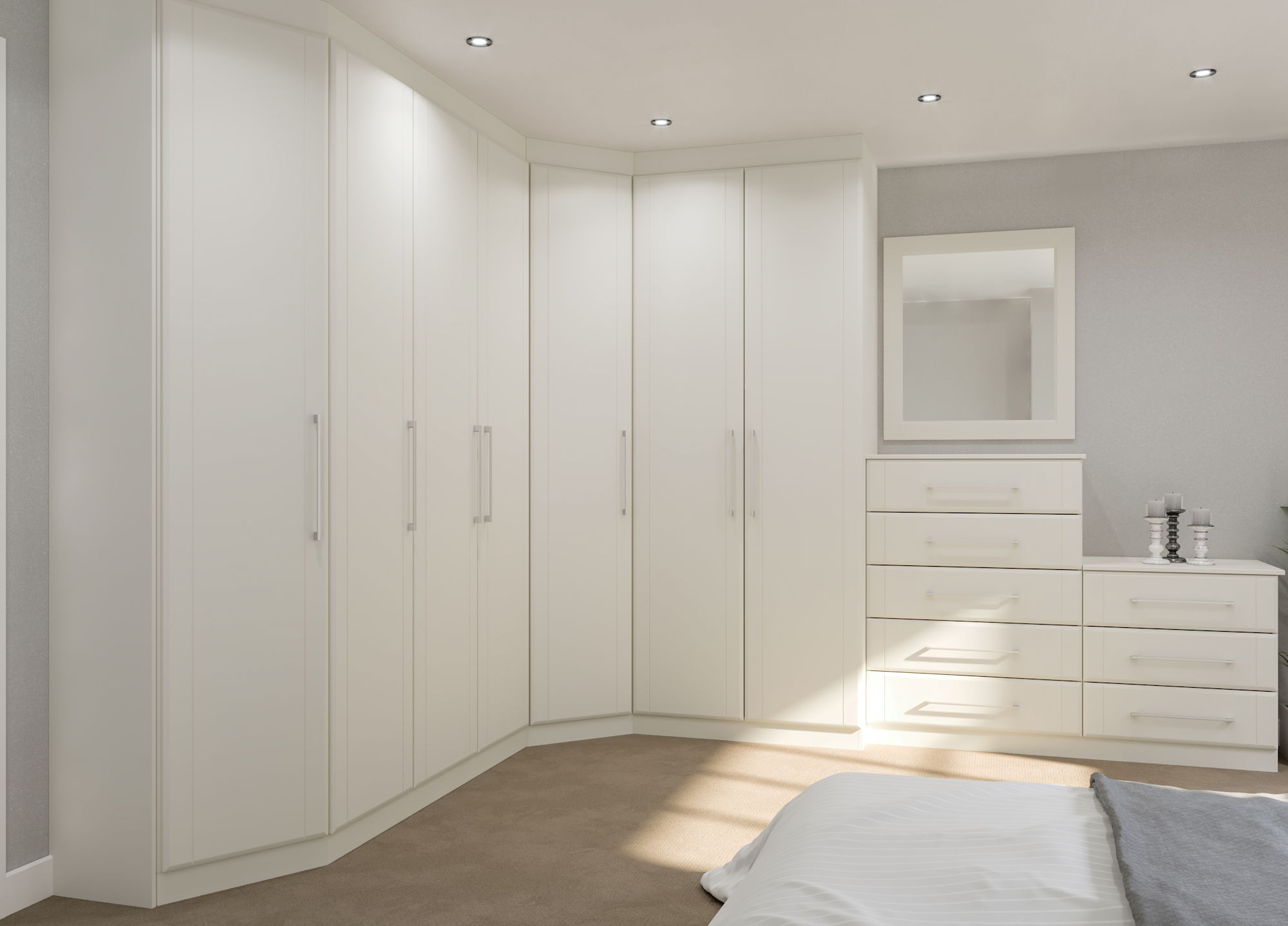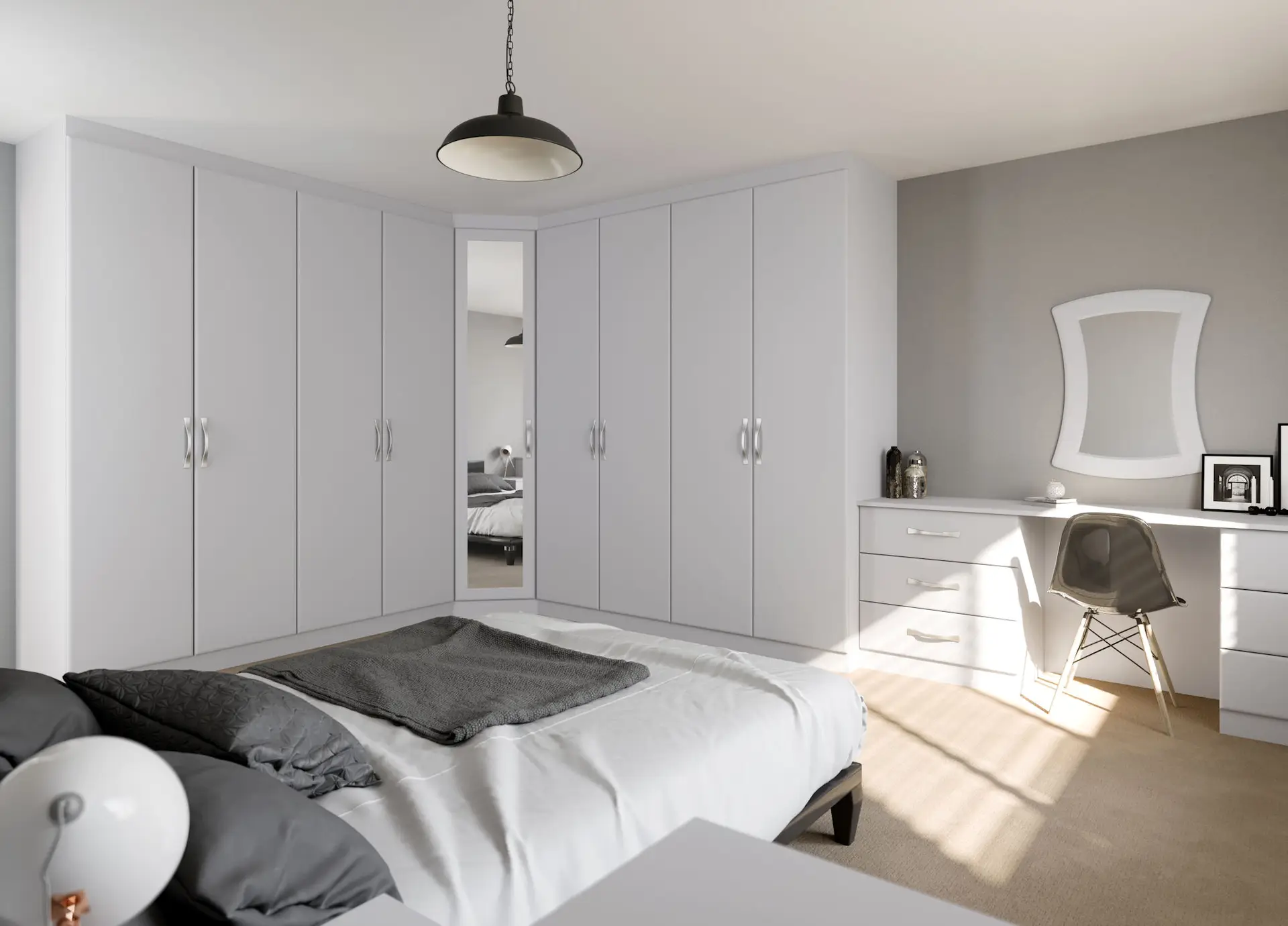 The gently chamfered edge of Milan creates a stylish contemporary bedroom. The made to measure wardrobes have ample storage for all your clothing needs whilst the matching dressing table takes care of all your beauty or accessory needs.