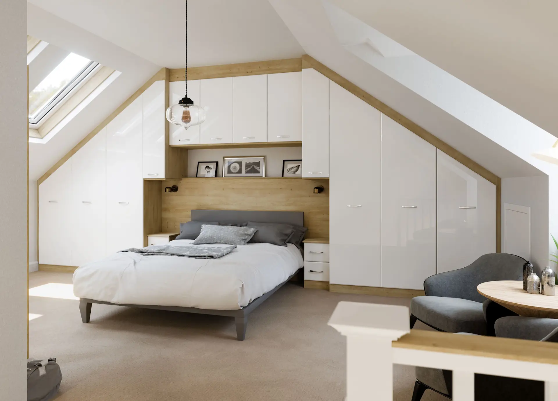 Sleek white gloss mixed with the warmth of oak creates stylish storage in an otherwise unusable space in the eaves. Who knew sloping ceilings and awkward angles could look so good!