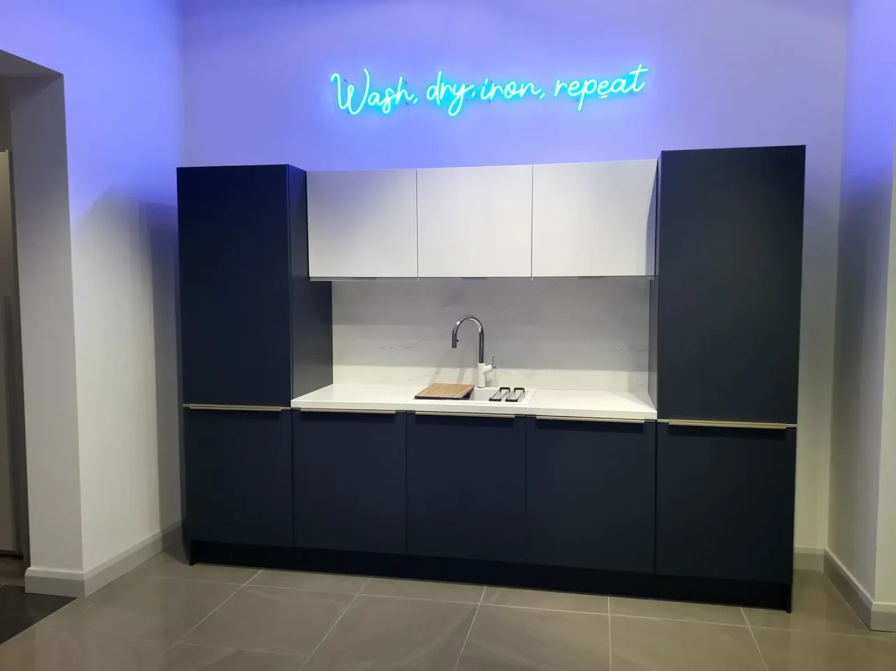 A perfect balance of function and style. The bold contemporary look of deep indigo cabinetry paired with clean white overhead storage creates a space that makes everyday routines feel effortless.
