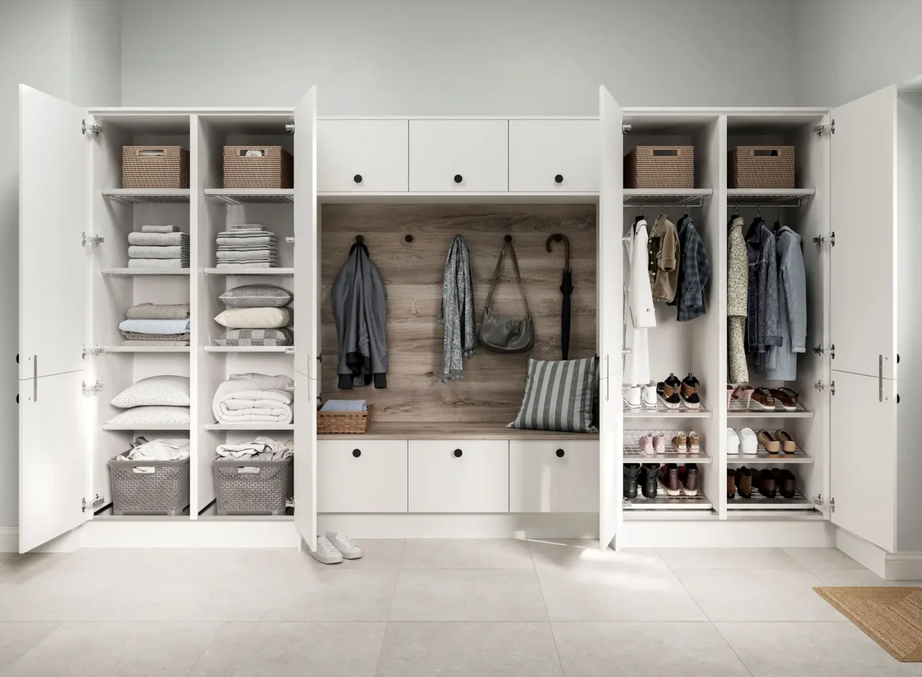 Coats and shoes are kept neatly out of sight with clever internal storage options whilst mixed shelving creates much needed extra storage.